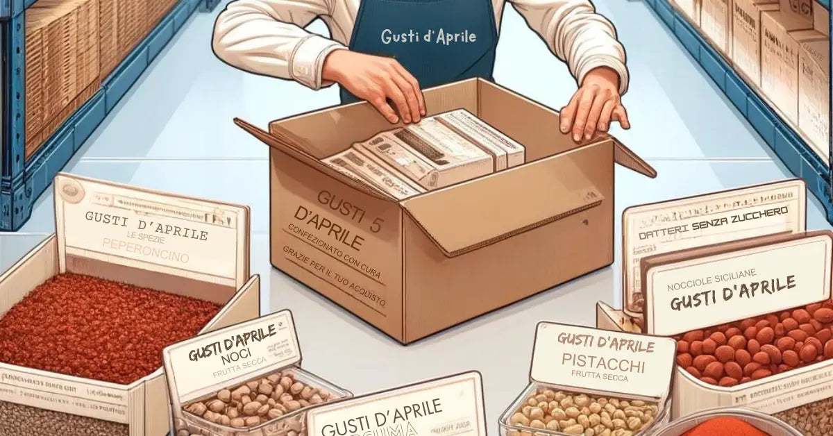 Gusti d'Aprile imballa accuratamente I tuoi prodotti in una scatola, pronti per la spedizione. L'attenzione al dettaglio assicura che ogni articolo arrivi integro al destinatario.